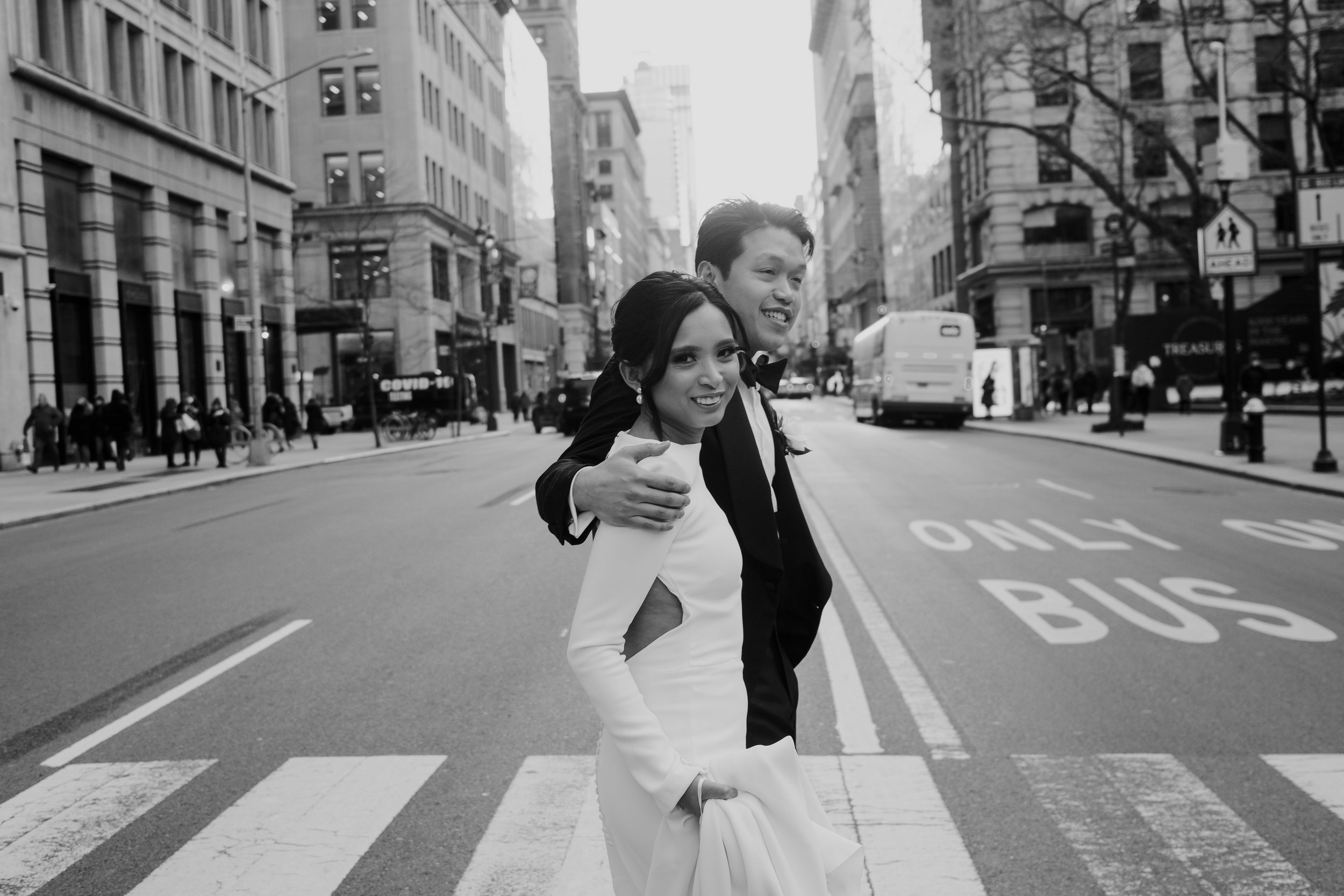We started our day in Dominic and Sindell’s hotel room getting ready, where they had a 180-degree, panoramic view of the city. For the first look photos, we made our way to the New York Public Library, famous for their Beaux-Arts style of architecture. We then made our way to the St. Patrick’s cathedral for their ceremony, one of the largest cathedrals in the country. Afterward, we took photos on the streets of New York and made sure to make it extra NY by taking photos near hotdog stands, taxi cabs, and 5th avenue. After the shoot, we walked to the Pool for their reception, one of New York’s premier event destinations known for its interior elements such as the glass walls the ceiling’s recessed lighting fixtures, and the pool in the middle of the dining area.