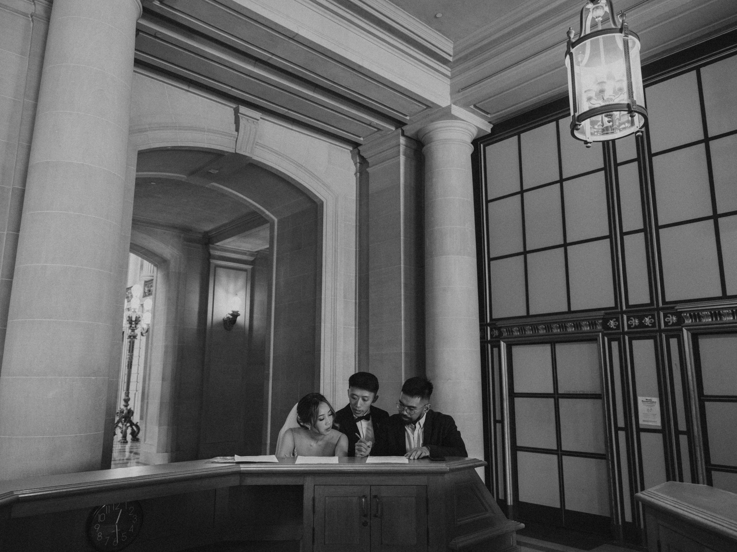 One of the ways we get a completely empty staircase in photos is by arriving right when City Hall opens. This way, you’ll have the opportunity to take your time and capture the beautiful architecture and grand staircase without any interruptions or other people in the background. As the day progresses, clusters of guests and couples start to congregate at the base of the stairs and the civil ceremonies happen at the rotunda on top of the stairs so there is almost always a group at the top. This is why it’s ideal to schedule your arrival time as early as possible. The last ceremony spot is 3:30 PM, so afterwords is another opportunity for photos.